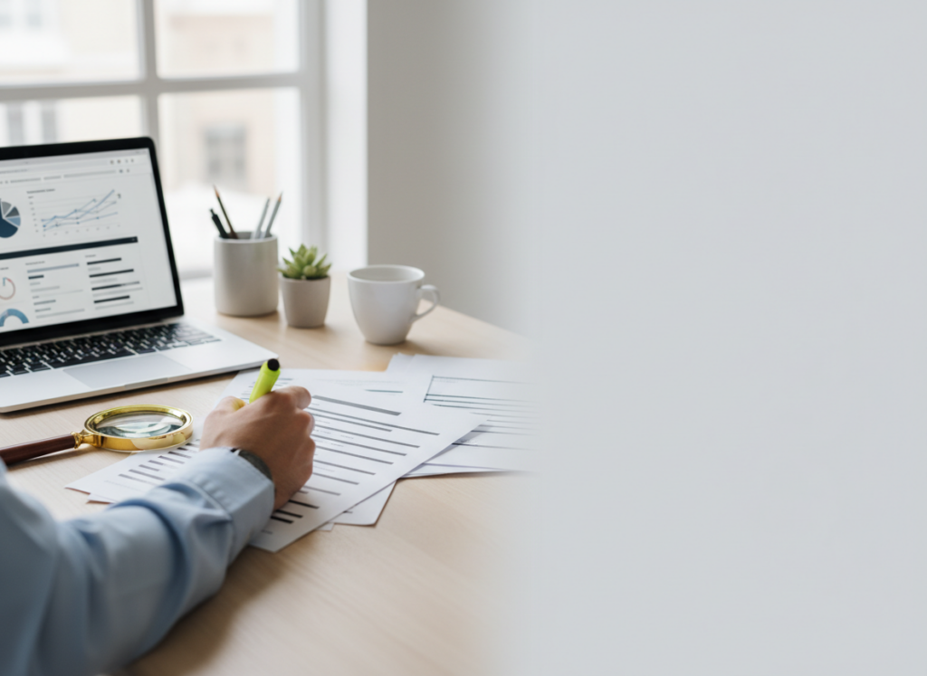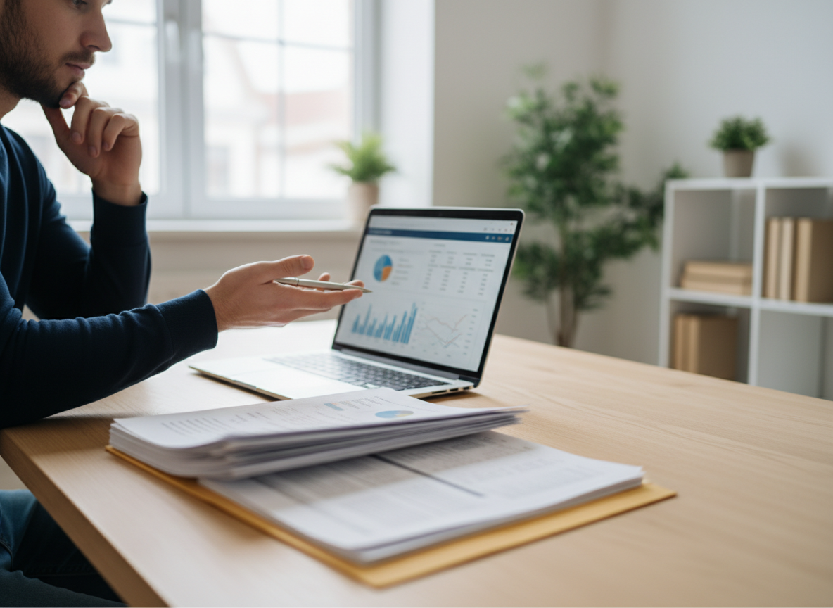 FCRA credit dispute — person reviewing credit report on laptop with papers, photorealistic, wide header with negative space